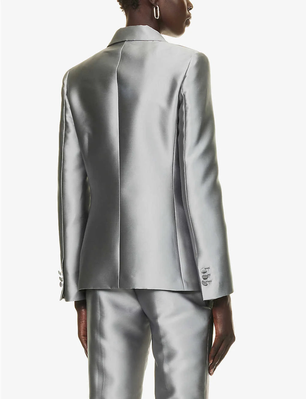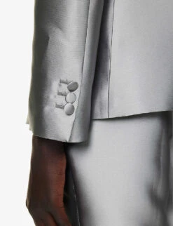 - Regular fit, single breasted, peak lapels, soft padded shoulders, long sleeves, buttoned sleeve hems, two flap pockets at front, satin texture, fully lined