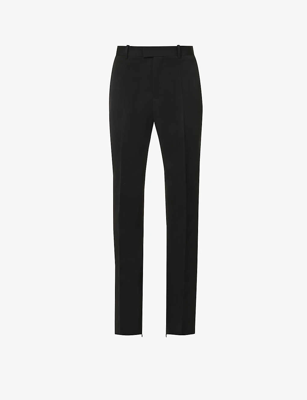 - Regular fit, mid-rise, straight leg, structured waistband with belt loops, two slip pockets at front, darts at back, welt pocket at back, pressed centre creases, zip at hems