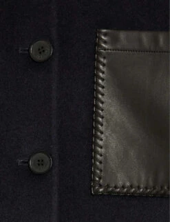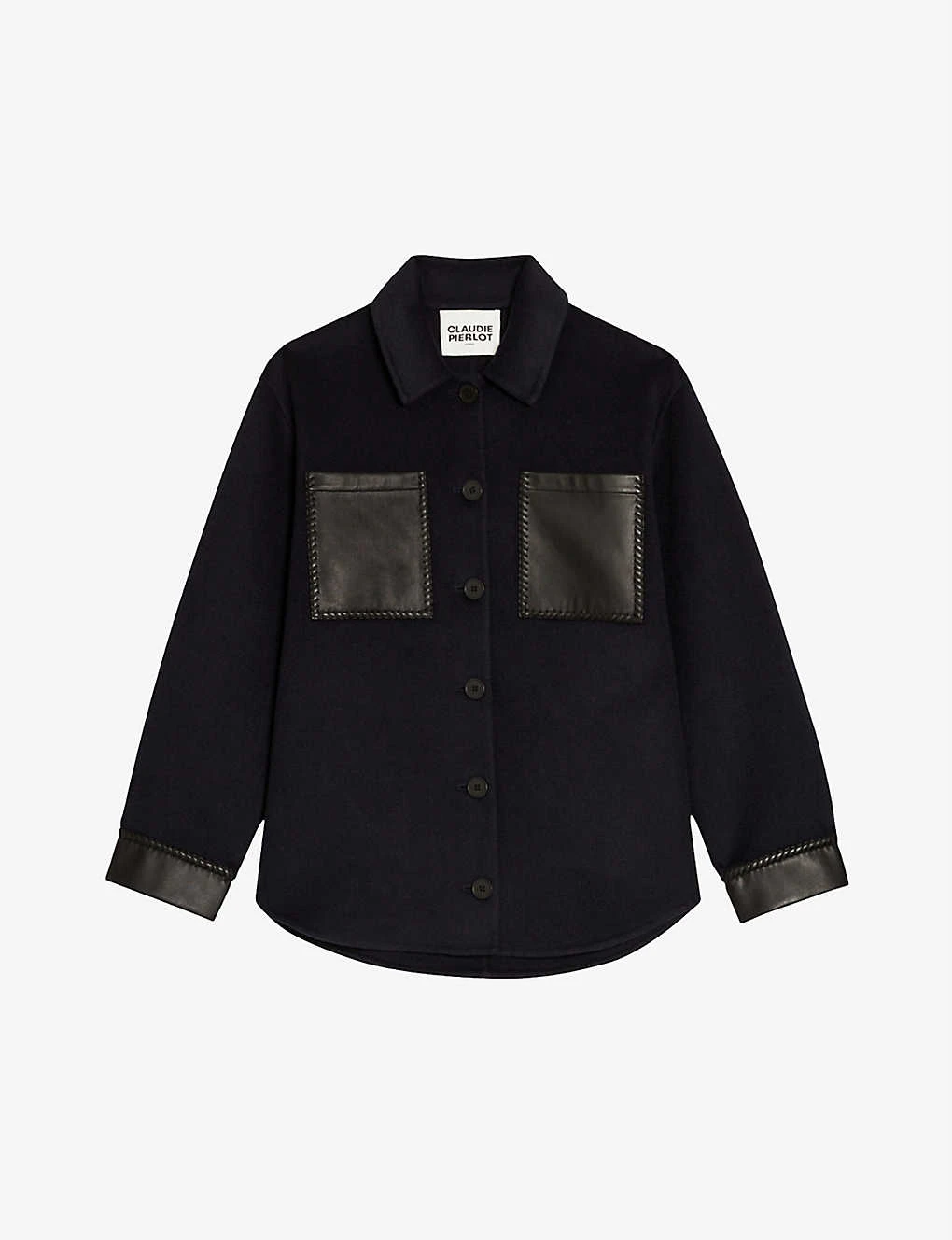 - Collar, long sleeves, contrasting faux-leather trim cuffs, faux-leather patch pockets at the chest, curved hem