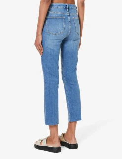 - Slim fit, high rise, straight leg, structured waistband with belt loops, five pockets, curved yoke at back, mid-faded wash, contrast stitching, branded silver-toned hardware, raw hems