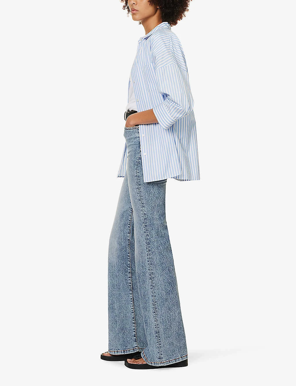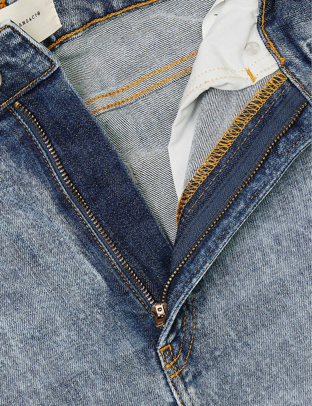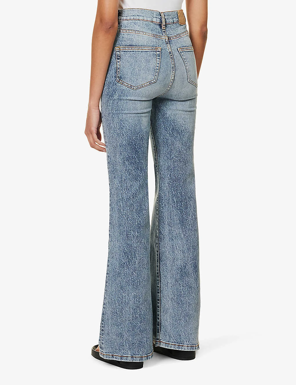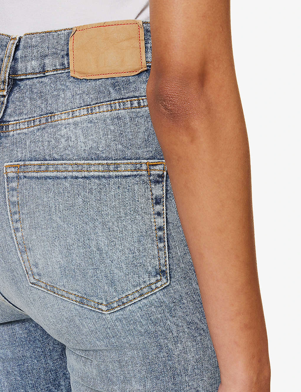 - Slim fit, high rise, wide leg, structured waistband, belt loops, five pockets, contrast stitching, brand patch at back, faded wash, silver-toned hardware