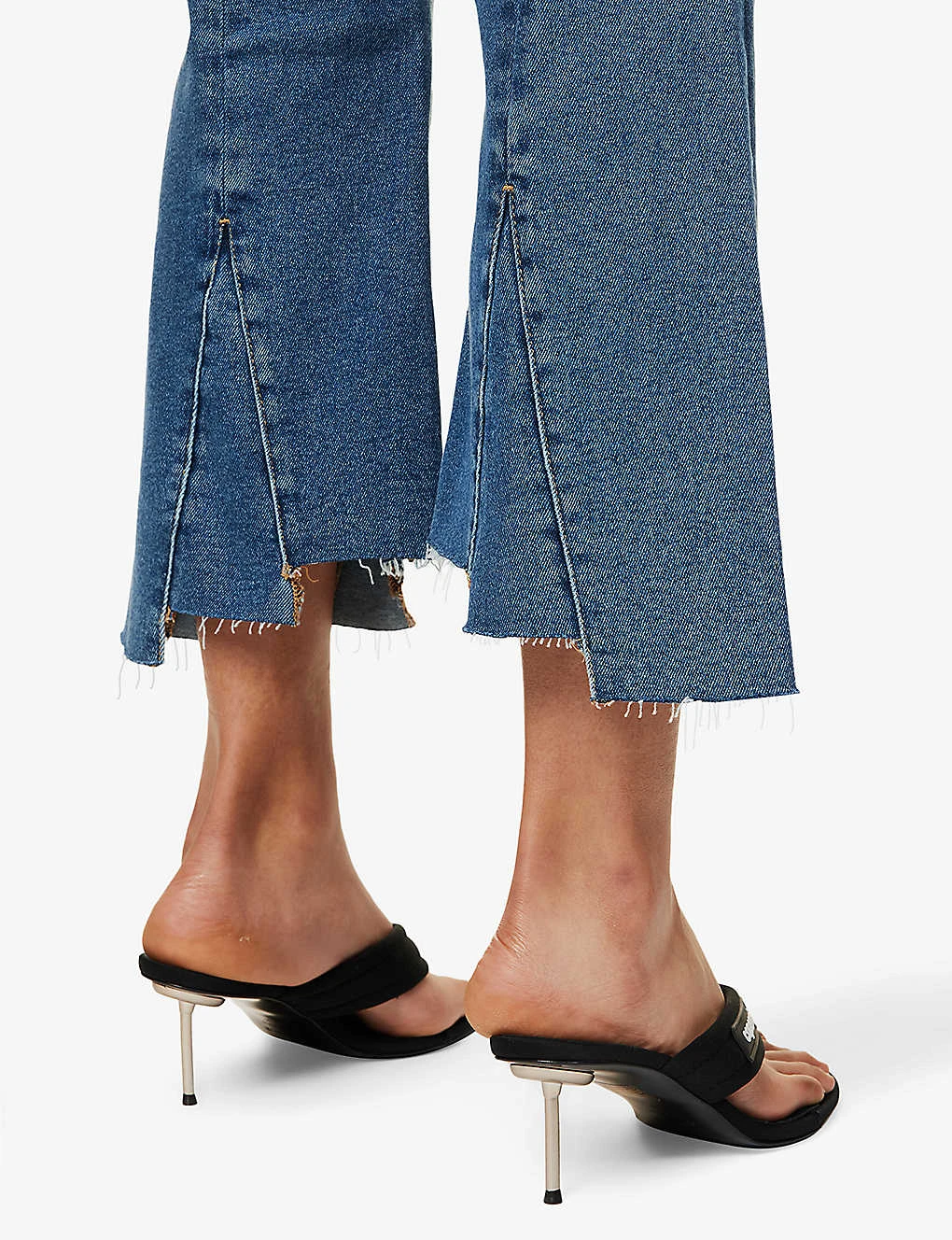 - Regular fit, mid-rise, cropped bootcut leg, structured waistband with belt loops, five pockets, curved yoke at back, mid-wash, panelled pattern, asymmetric raw hems, silver-toned hardware
