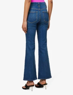 - Regular fit, mid-rise, flared leg, structured waistband with belt loops, five pockets, curved yoke at back, mid-wash, contrast stitching, silver-toned hardware