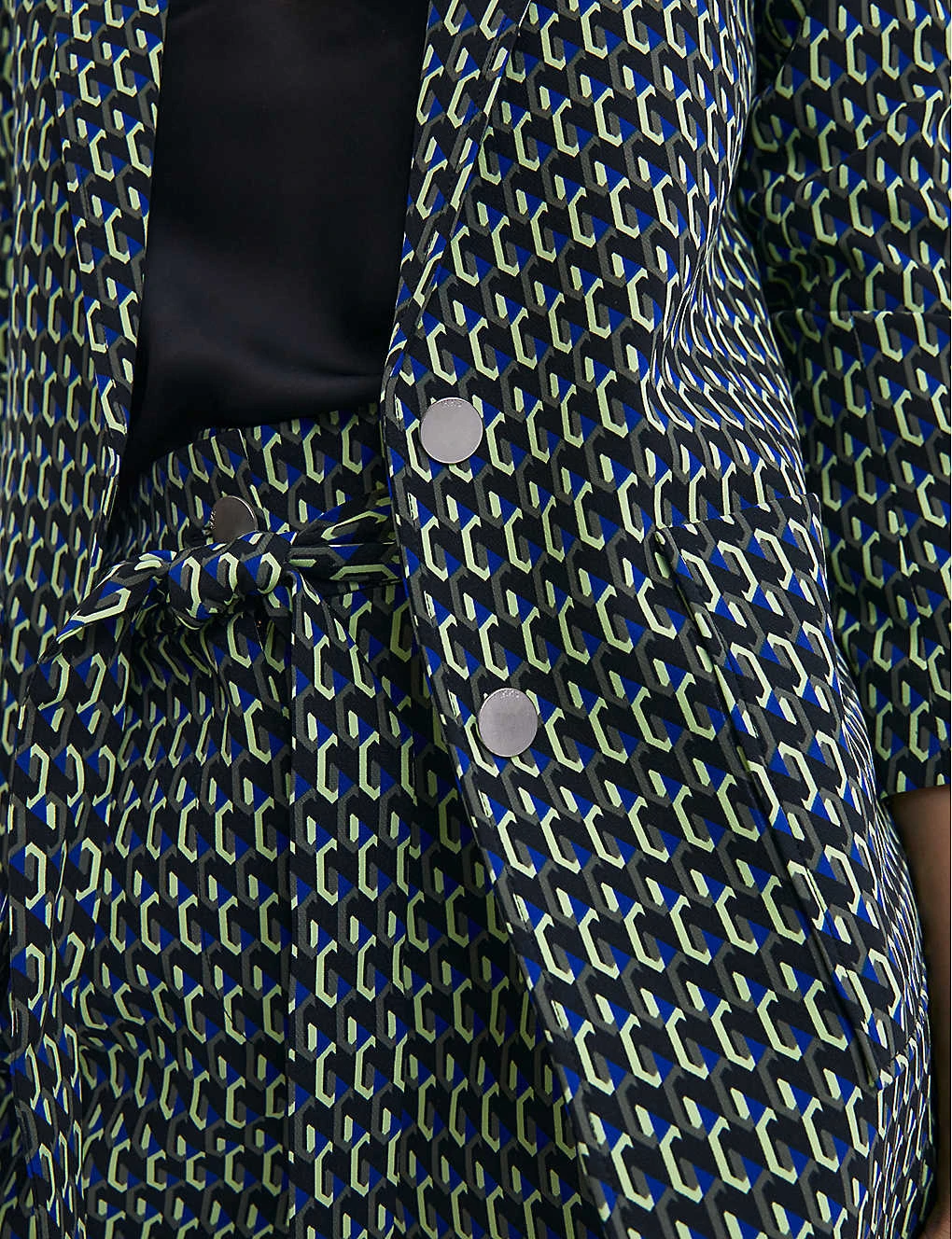 - Peak collar, notched lapels, long sleeves, branded buttons at front, two patch pockets at front, all over graphic print, silver-tone hardware