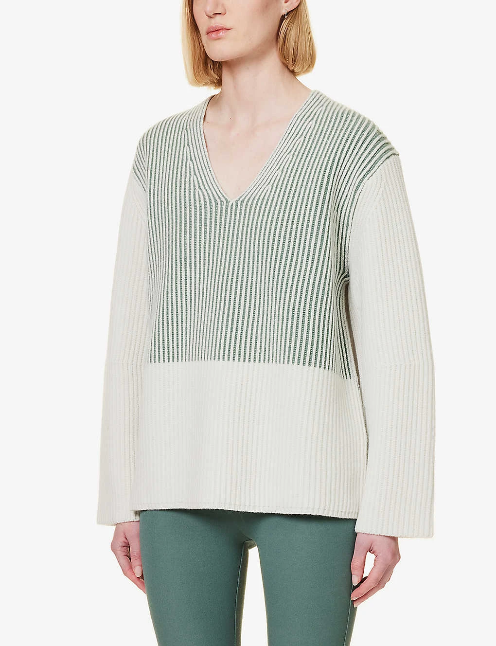 - Relaxed fit, V-neckline, long sleeves, all-over ribbed knit pattern, colour block pattern, medium knit