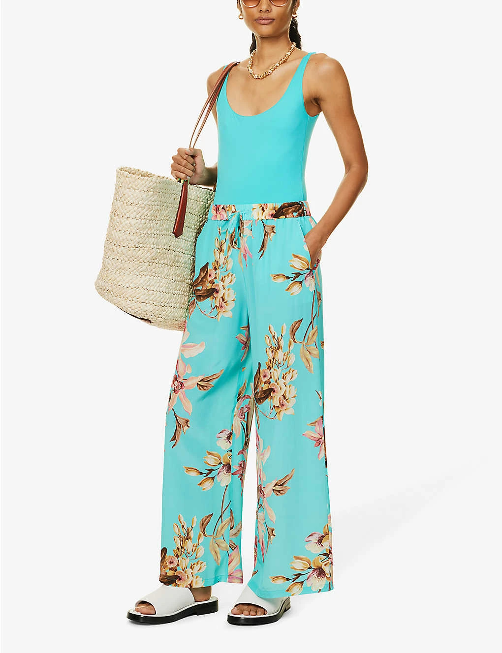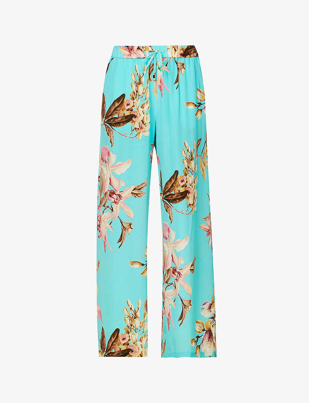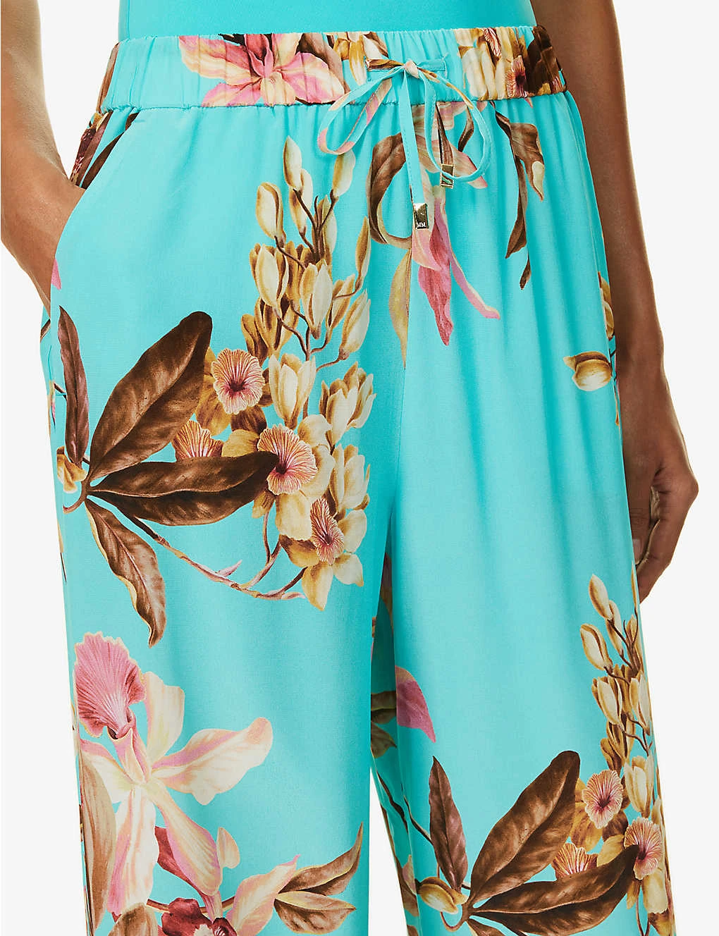 - Relaxed-fit, high-rise, wide leg, elasticated drawstring waistband, two slip pockets at front, all-over floral pattern, gold-toned hardware