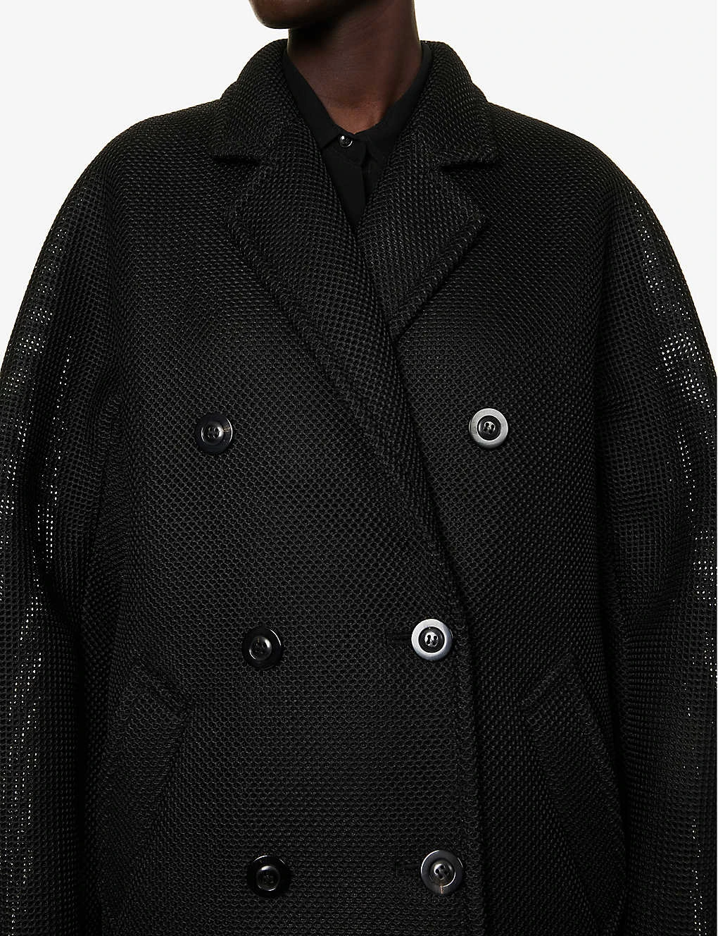 - Relaxed fit, notch lapel, double-breasted, dropped shoulders, long sleeves, straight cuffs, two welt pockets at front, all over knitted, all over cut-out pattern, straight hem