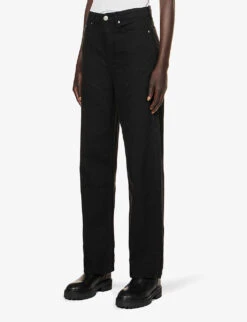 - Straight fit, high rise, wide leg, belt loops, five pockets, V-shaped yoke at back, branded silver-toned hardware