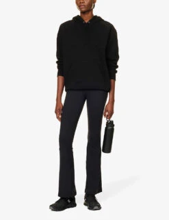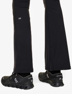 - Slim fit, high rise, flared leg, elasticated waistband, brand print at back, exposed seam stitching