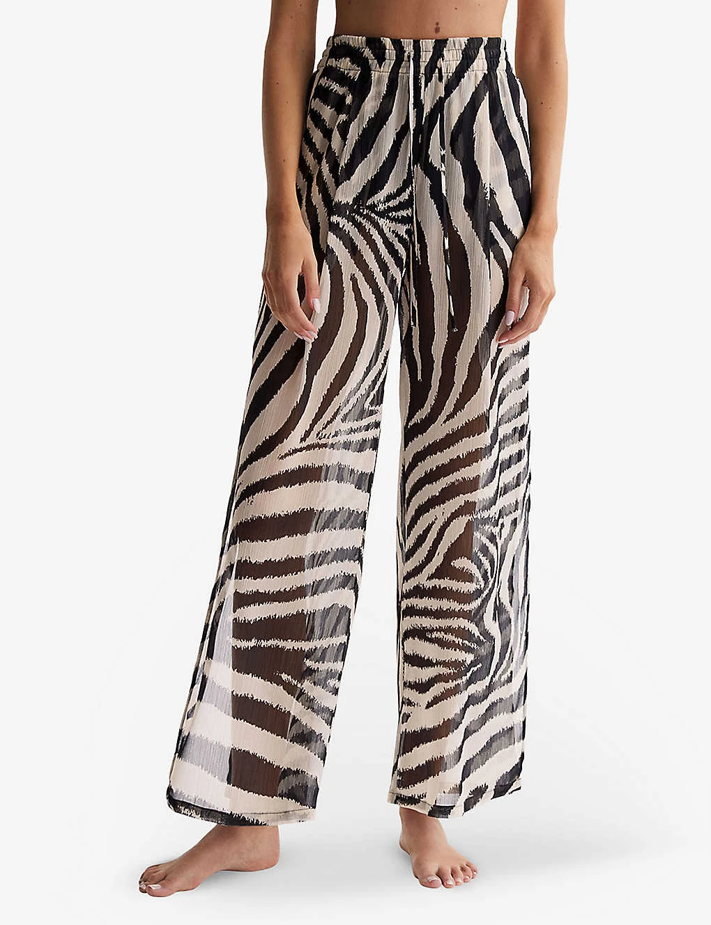 - Wide leg, high rise, drawstring waistband, all-over zebra print, split hems
