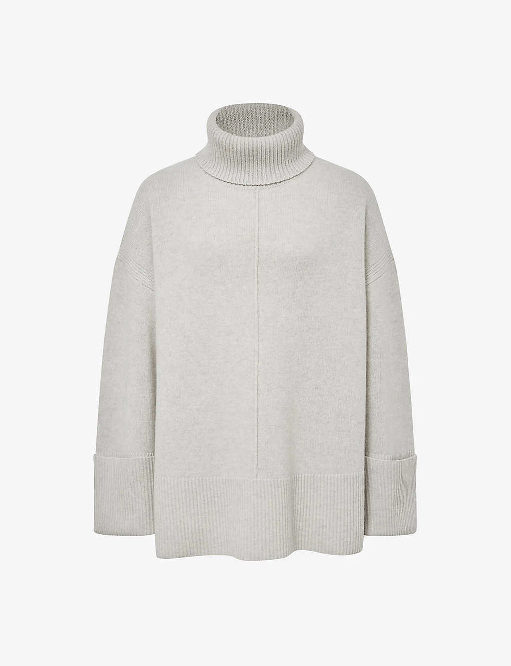 - Relaxed fit, long sleeves, roll neck, knitted construction, ribbed trims, turned-up cuffs, front seam, straight hem