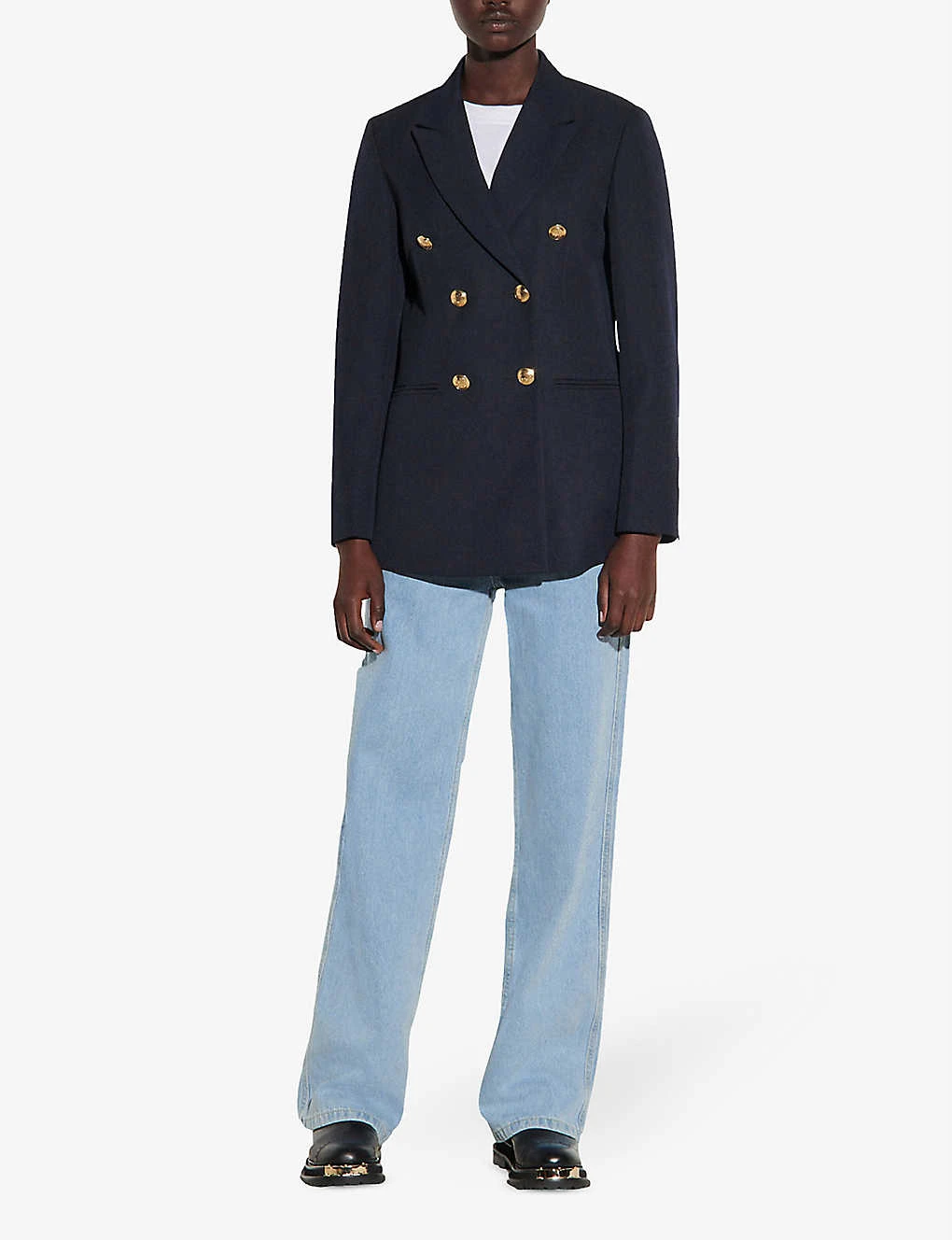 - Double-breasted, peak lapels, padded shoulders, long sleeves, split cuffs, one patch pocket at front, two jet pockets at front, branded buttons, tonal stitching, fully lined