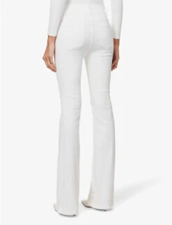 - Regular fit, high waist, faux pockets at front, belt loops, two patch pockets at back, flared leg, silver toned hardware