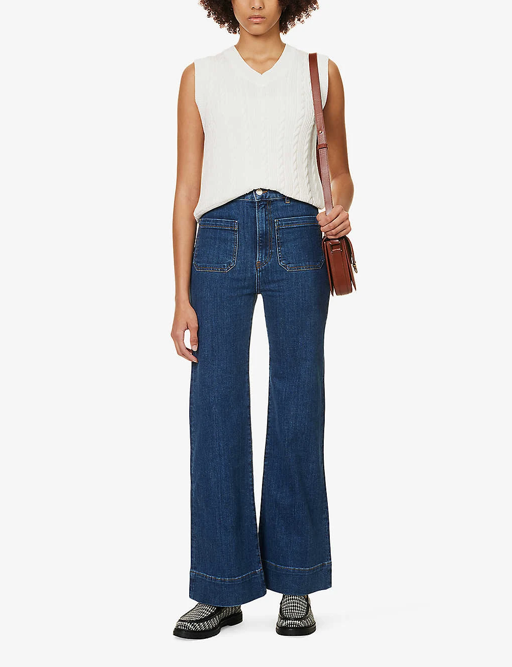 - Regular fit, high rise, flared leg, belt loops, contrast stitching, two patch pockets at front, darts at back, two patch pockets at back, brand patch at back