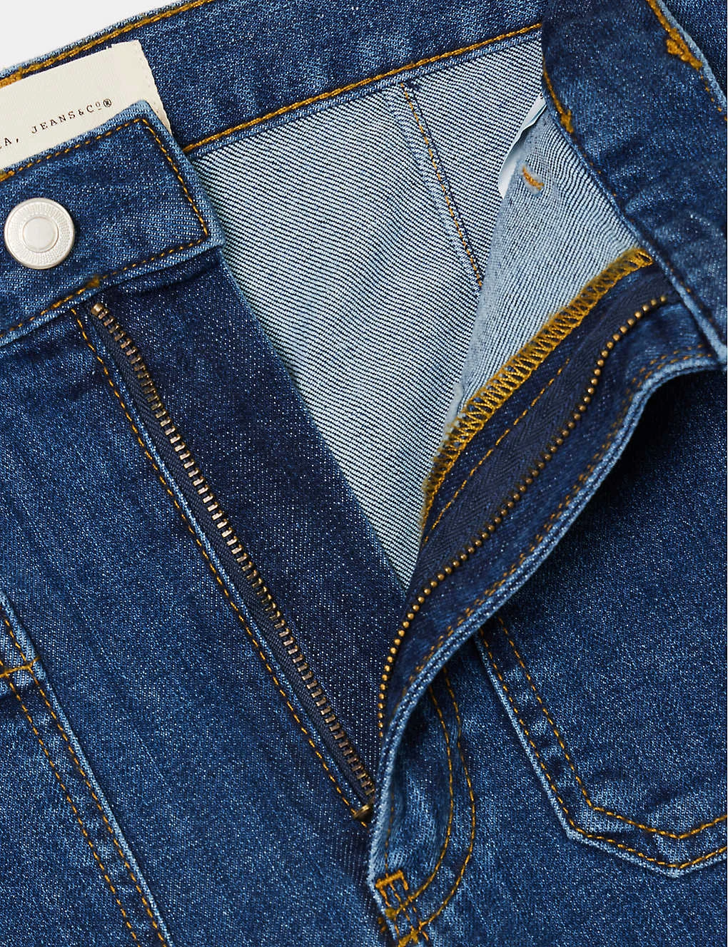 - Exposed button and concealed zip-fly fastening at front