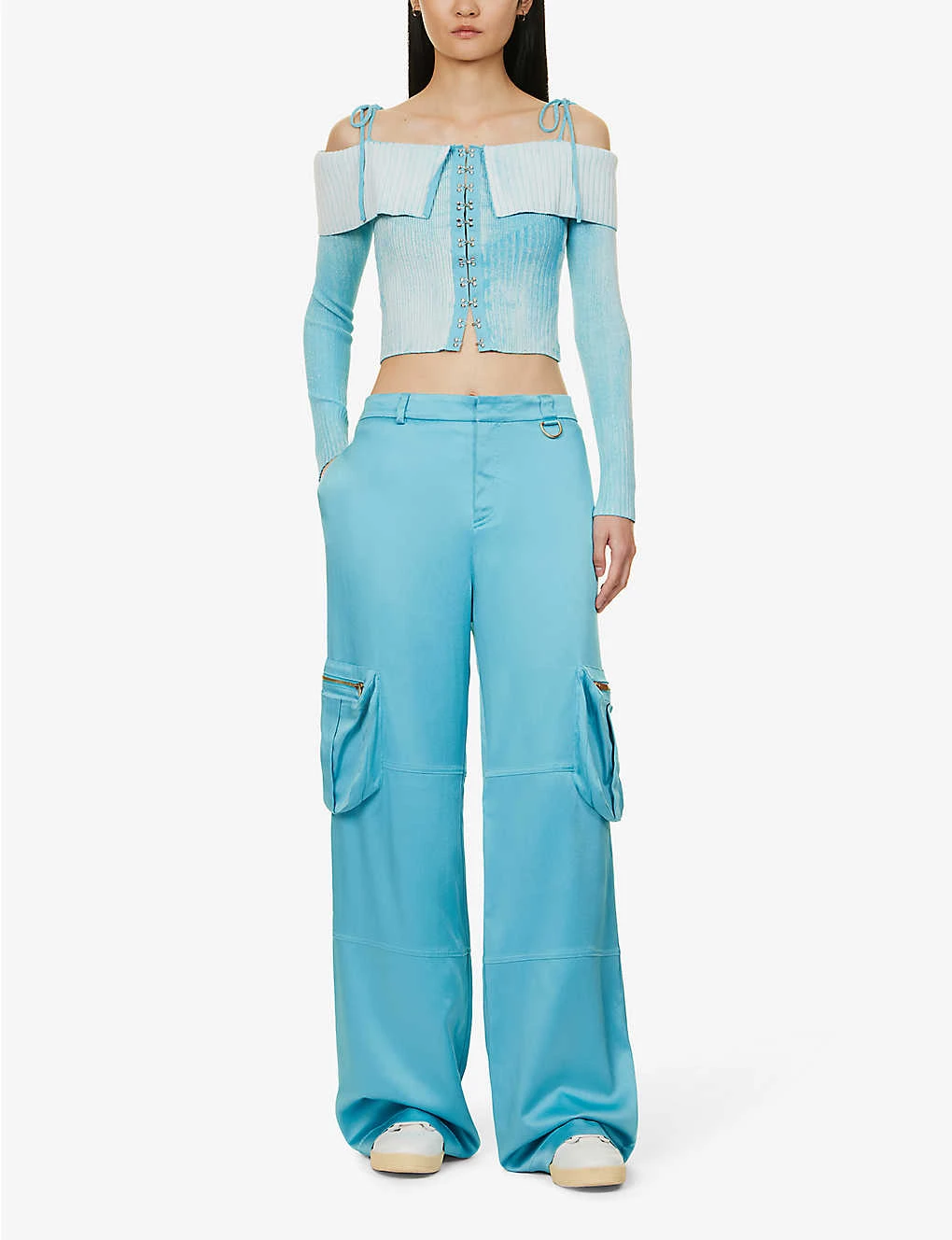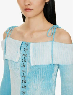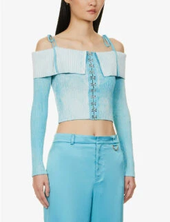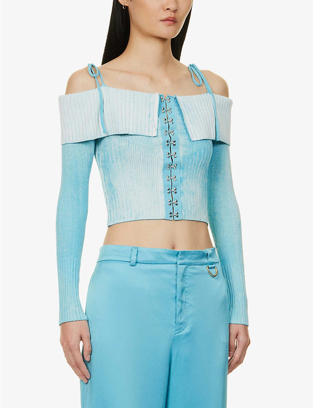 - Slim fit, straight across neckline, exposed shoulders, long sleeves, faded wash, ribbed knit texture, silver-toned hardware, cropped