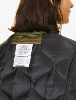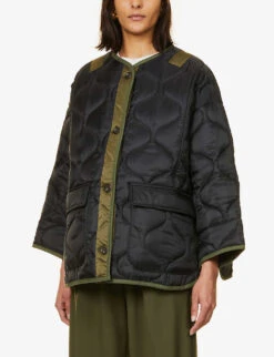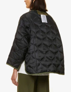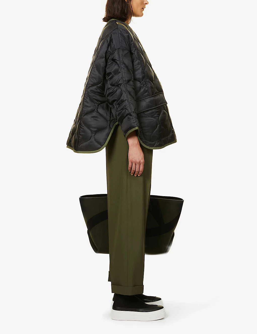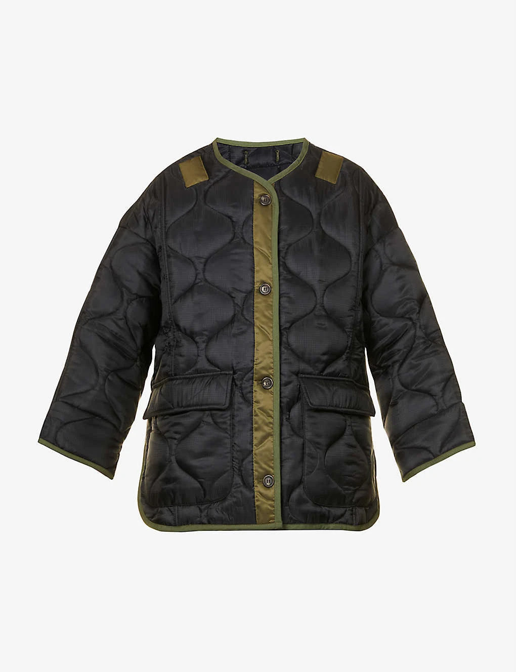 - Round neck, dropped shoulders, long sleeves, notched cuffs, oversized fit, two flap pockets at front, all-over quilted texture and padding, contrasting trims, curved hem