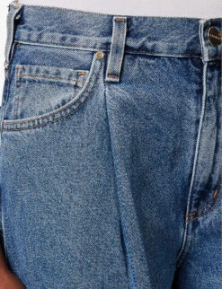 - Regular-fit, high-rise, wide leg, belt loops, pressed pleats at front, branded silver-toned hardware, all-over faded wash, contrast stitching, debossed brand patch at back, V-shaped yoke at back, partially lined