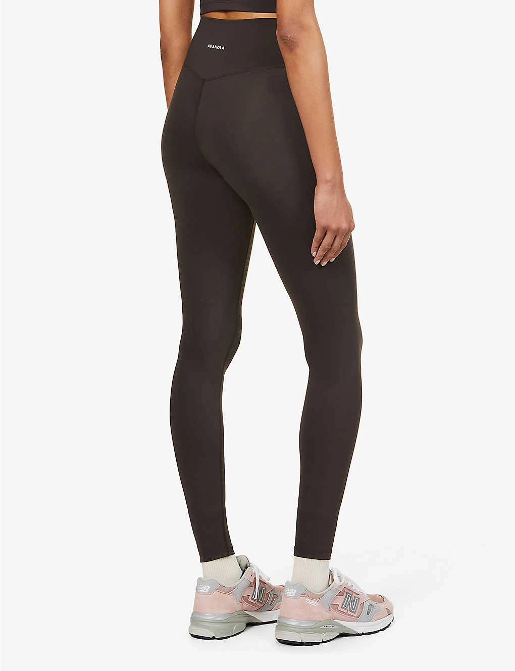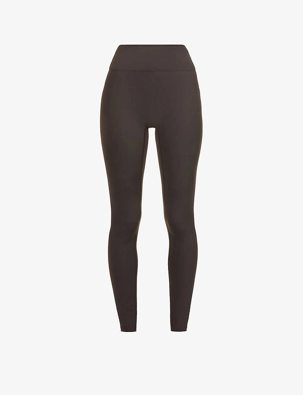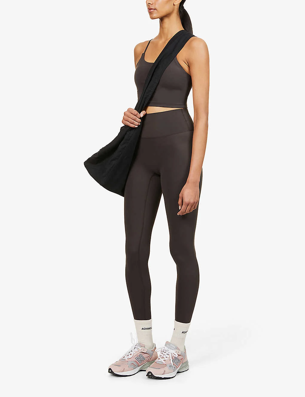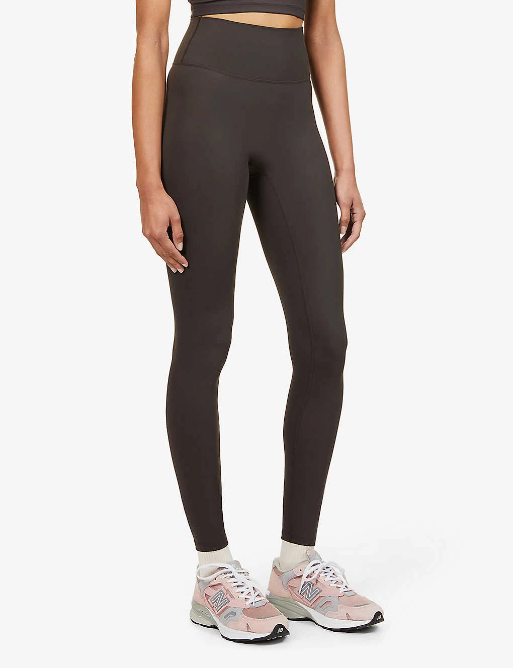 - Slim fit, high rise, full-length leg, seamless at front, brand text print at back, four-way stretch fabric
