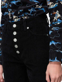 - High-rise, straight, belt loops, five pockets, whiskering at front, branded hardware, cropped, straight hems