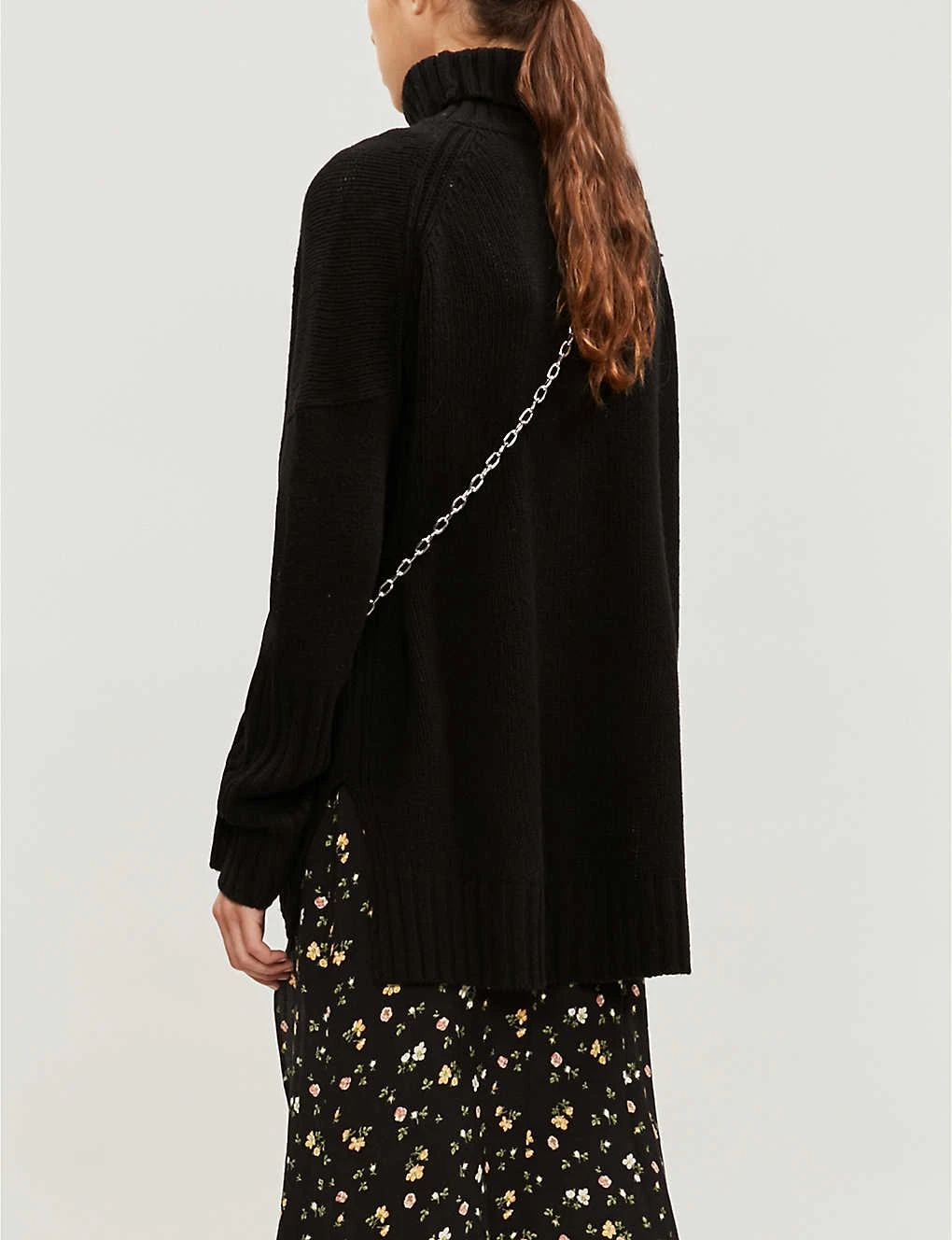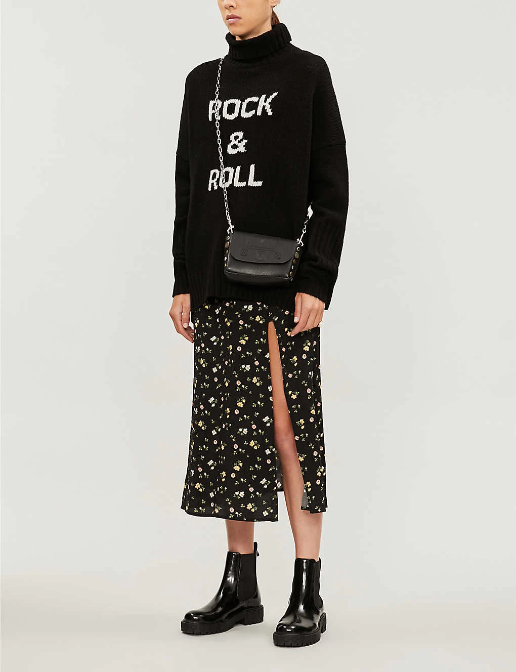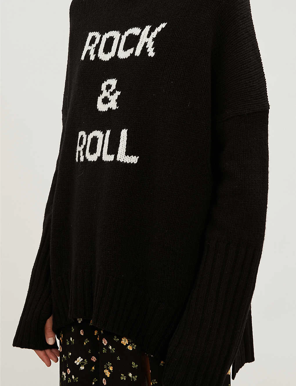 Turtleneck, long sleeves, knitted text detail at front, oversized, chunky waffle knit, ribbed trims, stepped hem
